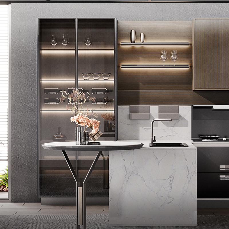 One of the standout features of this designer kitchen is the high cabinet with grey-tone glass double doors on the left side, which adds visual interest and provides ample storage space for all your kitchen essentials. The inserted lighting system in the open shelves and glass cabinets creates a warm and inviting ambiance, perfect for entertaining guests or enjoying a cozy night. This beige kitchen is functional and a statement piece that will elevate any home.