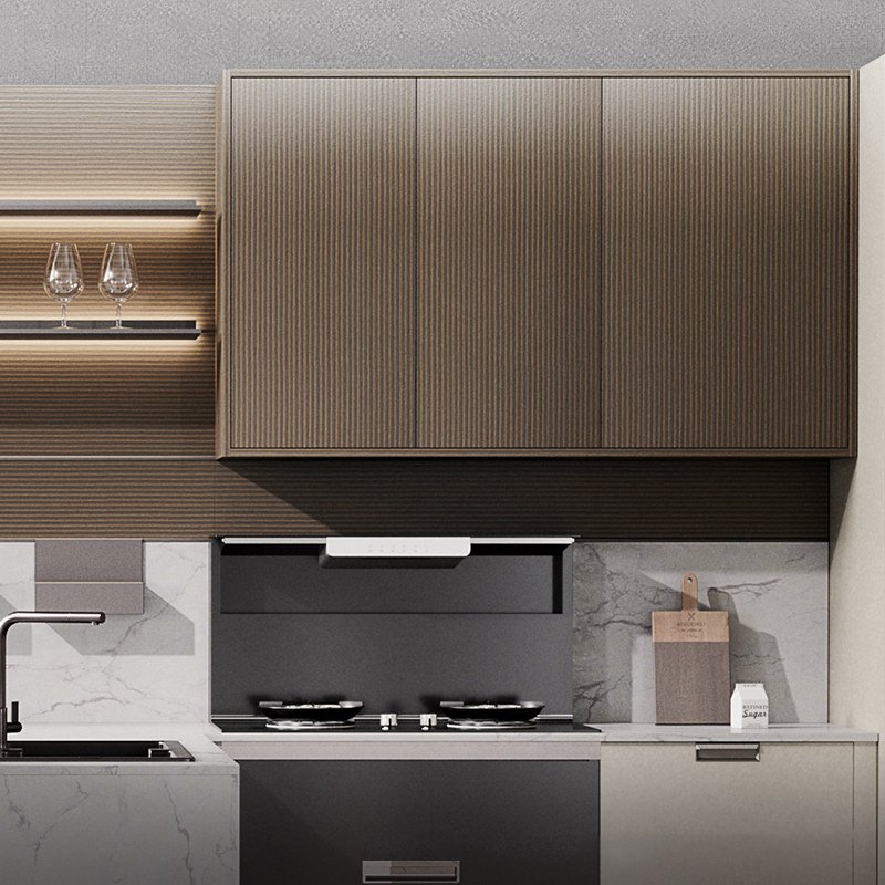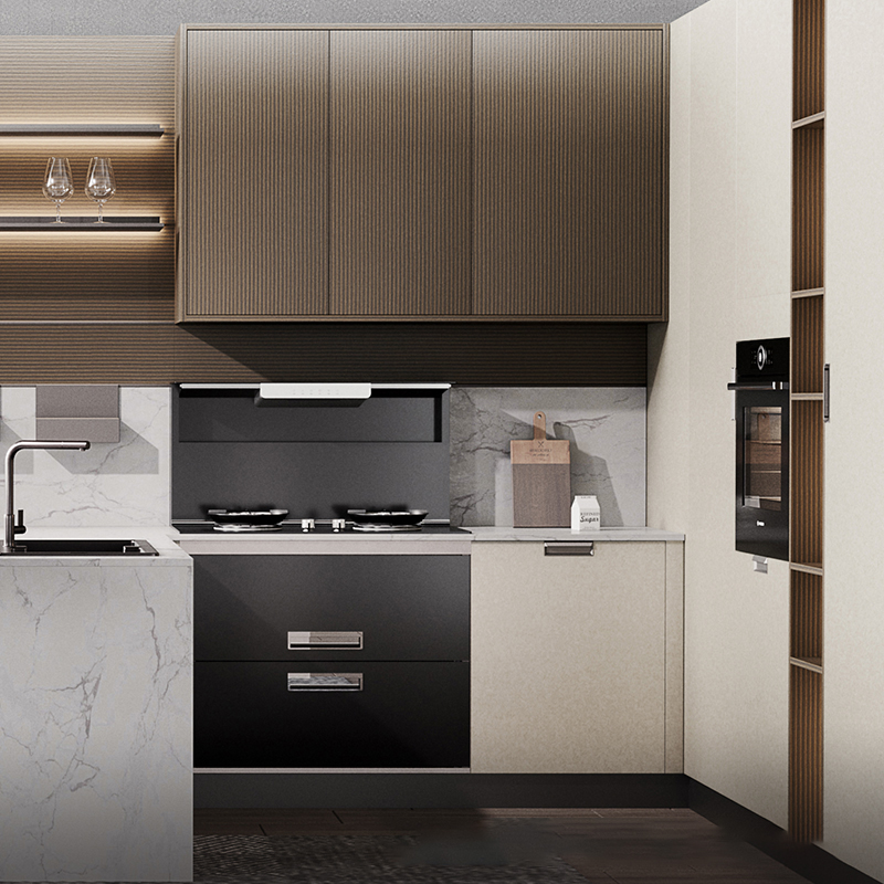 Our beige kitchen is perfect for anyone who wants to combine functionality with style. The L-shaped layout, white quartz countertop, beige melamine finish, and walnut finish on the wall cabinets and open shelves make this kitchen a standout feature in any home. The inserted lighting system adds warmth and ambiance, making this kitchen the perfect place to gather with friends and family.