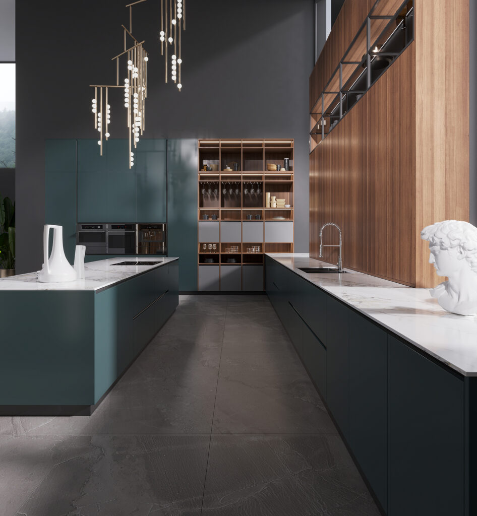 Featuring a stunning greenish-blue lacquer finish, perfectly complemented by a medium wood tone, these high-end kitchen cabinets create a harmonious balance between warmth and modernity. The handleless design adds a sleek and minimalist touch, enhancing the overall sophistication of your kitchen space.