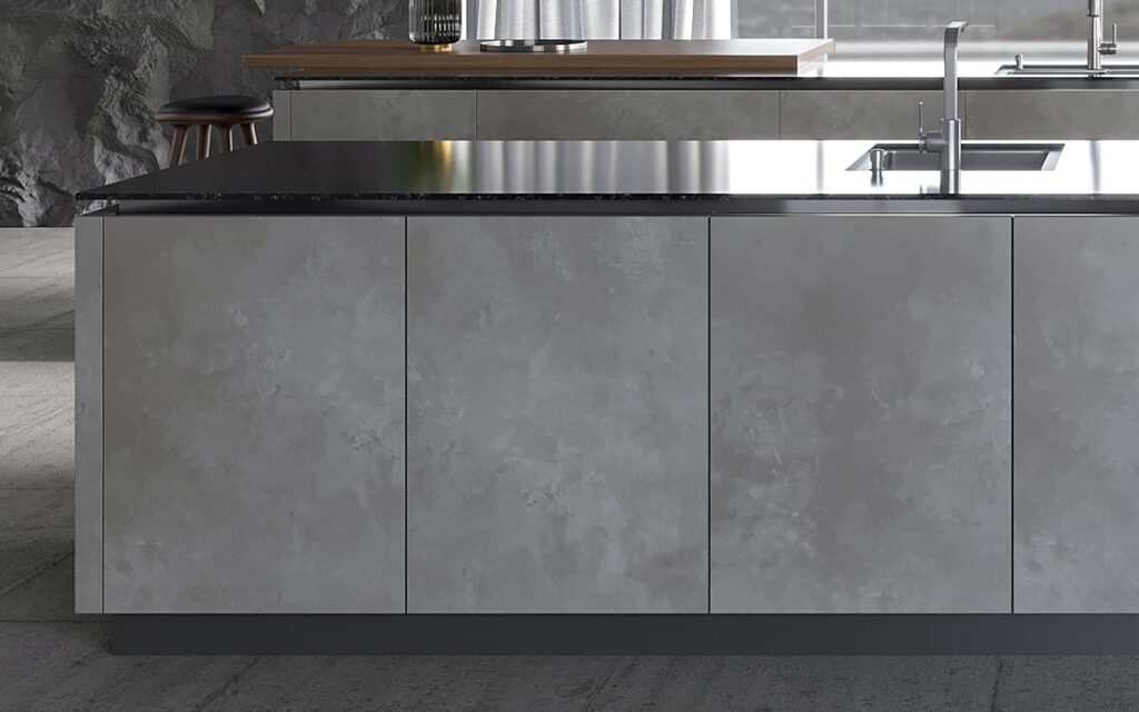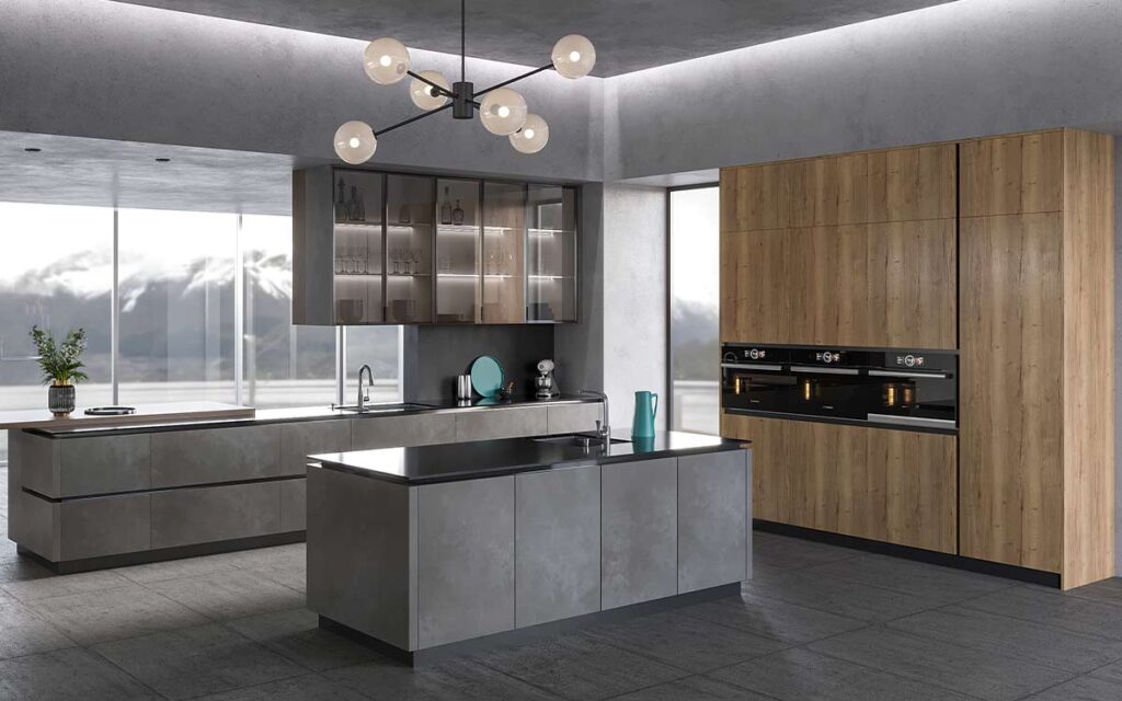 Our industrial kitchen design features a sleek and sophisticated combination of base and wall cabinets on one side and a multifunctional kitchen island and high cabinets built into the wall on the other side. The base and island cabinets are crafted with a striking grey stone effect UV lacquer finish, providing durability and a modern touch to your kitchen space.