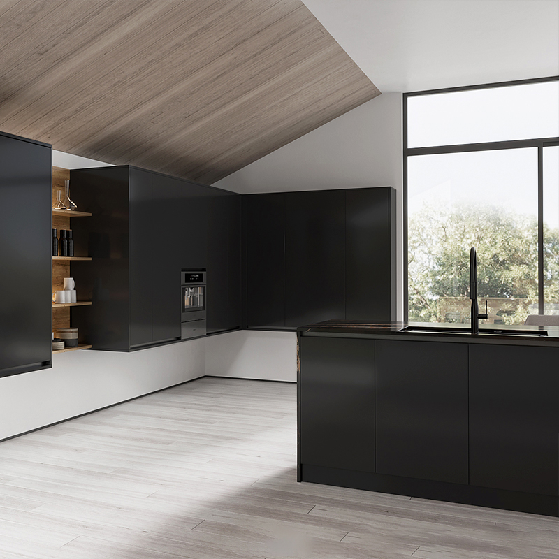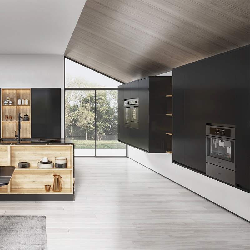 There are hidden light strips inside the natural wood open cabinets. The warm yellow light makes the complete kitchen cabinets set look more cozy and elegant. The countertop, sink, and faucet are all in black color, making the overall kitchen design more noble and luxurious.