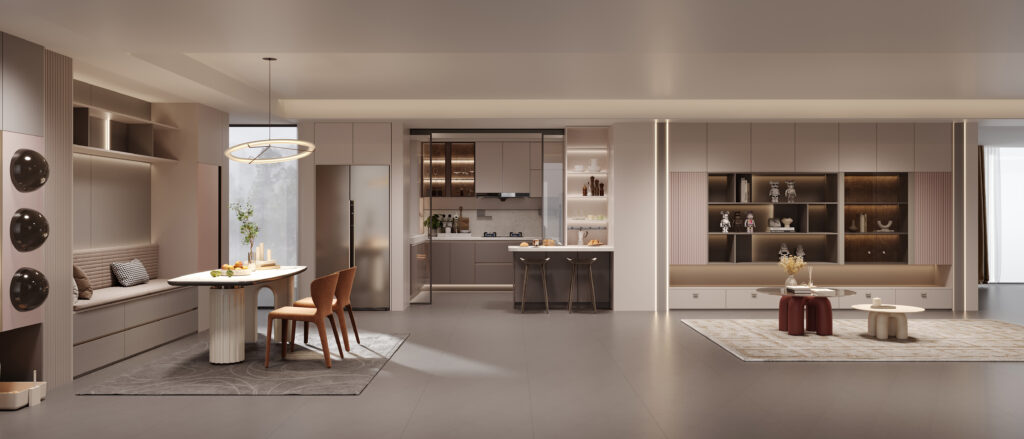 The enclosed kitchen uses a sleek black-framed glass sliding door to separate the kitchen from the dining area, maintaining a visual connection while effectively blocking out cooking odors and noise. The kitchen and dining area use soft beige, cream and gray tones to create a warm and welcoming atmosphere. The flat-panel cabinets mixed with light beige and dark gray create a simple and elegant look with ample storage space. The shelves next to the breakfast bar are used to display tableware and decorations, adding a sense of warmth and personality.