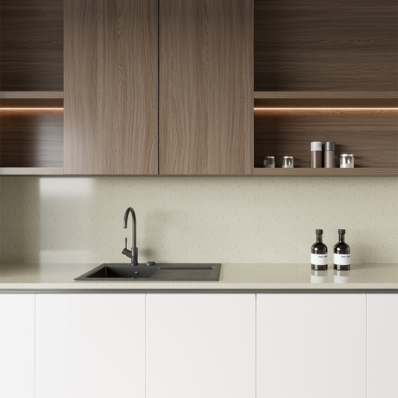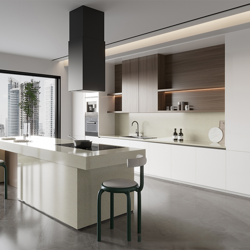 It is a minimalist gloss white kitchen design, crisp and efficient. The cabinet’s door handles are J pulls, creating a simple handleless outlook, practical and beautiful. And the addition of timber texture, beige island, and countertops adds a warm and welcoming feel to the kitchen.