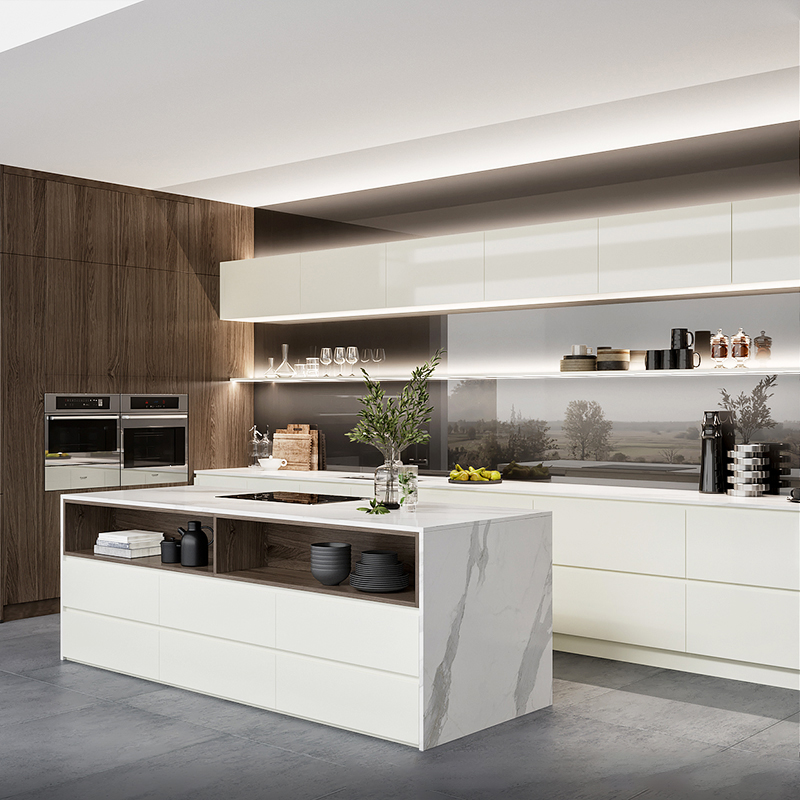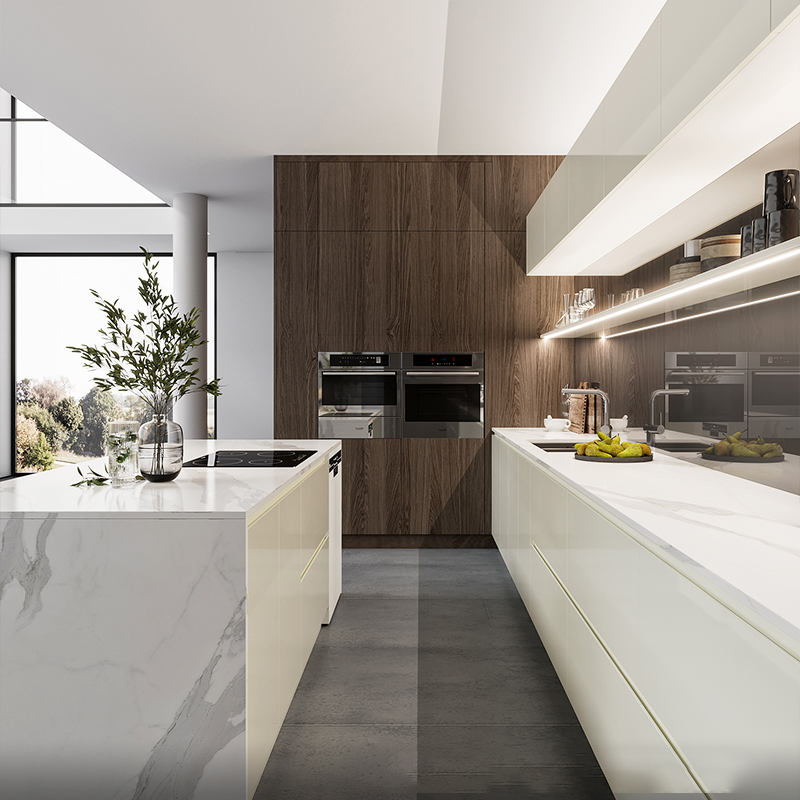 It is a large timeless parallel white kitchen with dark wood high cabinets. The parallel kitchen layout and handleless cabinets design make the kitchen design sleek and airy. The dark wood accents add warmth to the kitchen design, adding a cozy feel. The countertop is calacatta white quartz stone, offering an elegant look that’s easy to maintain.